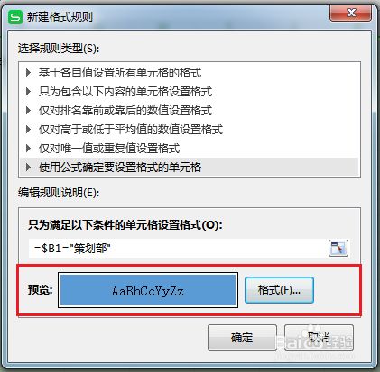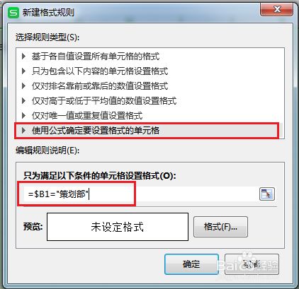 在弹出的对话框中选择利用公式确定要设置格局的单位格,鄙人面只为知足以下前提的单位格设置格局栏中,输入公式=$B1=”筹谋部”。