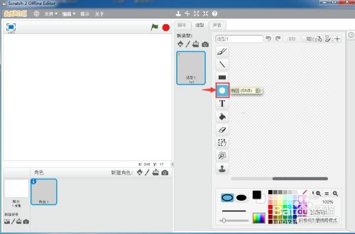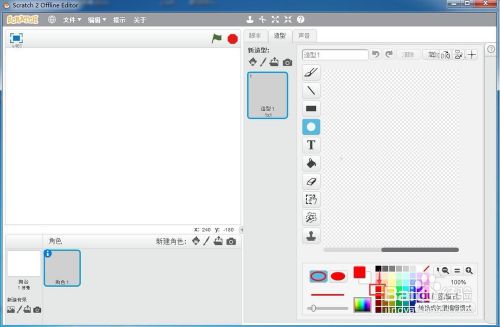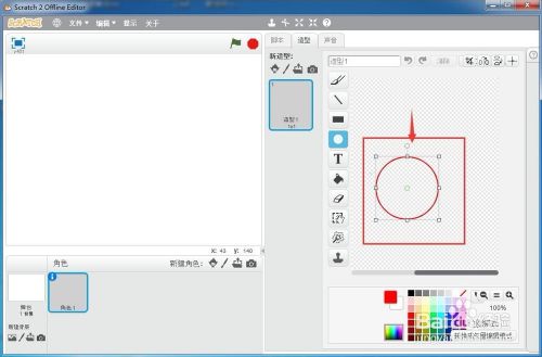 点击脚色1,在舞台中就可以看到一个圆形呈现,用这样的方式,我们就在scratch中建立好了一个红色边框的圆形。