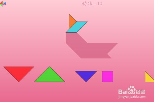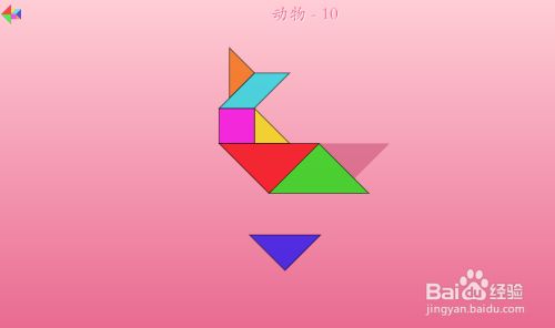 最后在绿色三角形拼块的右上侧,放上蓝色三角形拼块挨着,如图,这样就通关了。