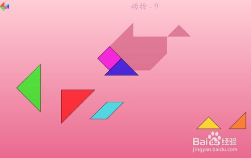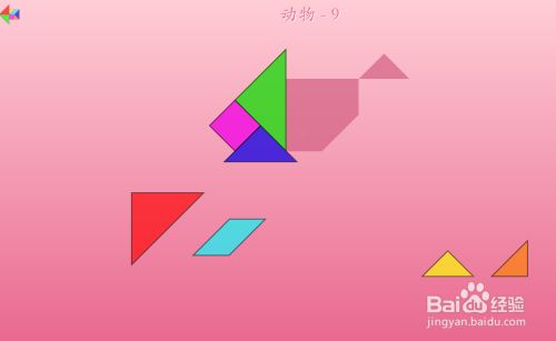 紧接着在粉红正方形拼块的右上侧,放上绿色三角形拼块挨着,如图。