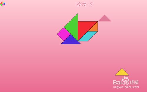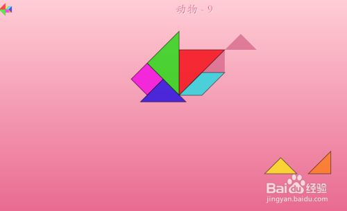 最后在橙色三角形拼块的右上侧,放上黄色三角形拼块挨着,如图,这样就通关了。