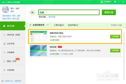 在360人工办事中,输入花屏关头词,点击右侧的查找方案按钮。