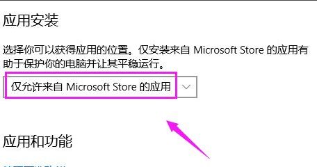 5、应用和功能界面里,应用安装设置的是仅许可安装来自Microsoft store的应用,如图。