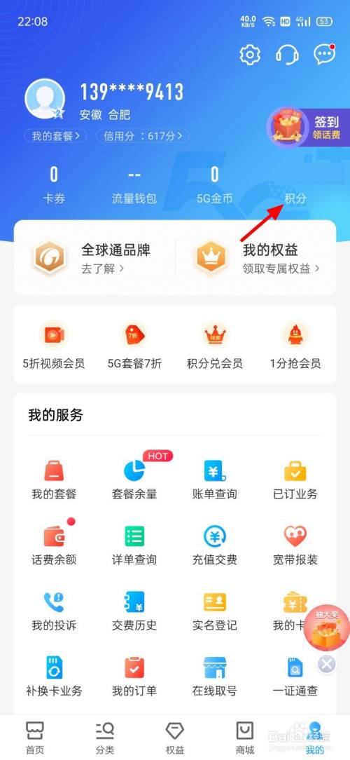 在我的界面,点击积分。