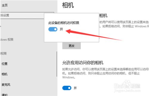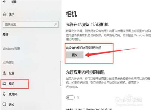 2、左侧栏找到相机,右侧我们就可以看到此设备的相机的拜候权限已封闭,点击更改。