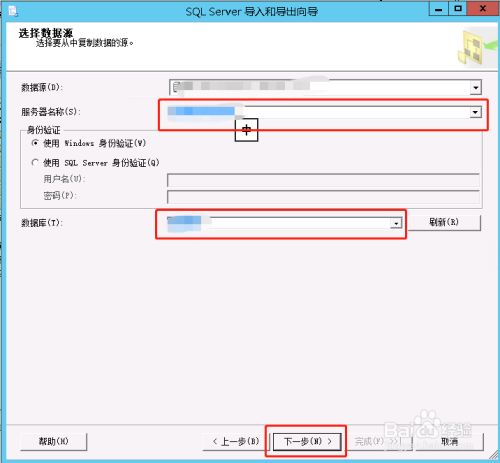 打开如下图界面,选择方针办事器名称,数据库名称,然后点击下一步按钮