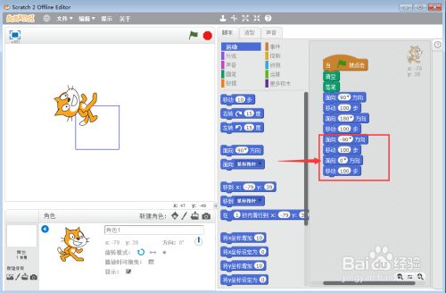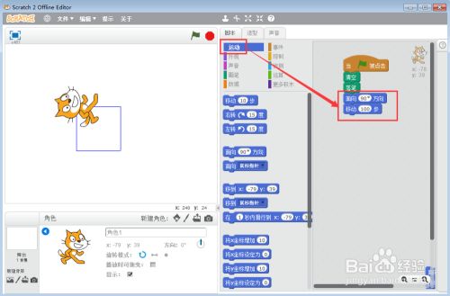 点活动模块,将面标的目的90度的偏向和移动10步拉到右边剧本编纂区,并将10改为100;