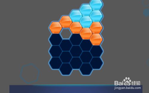 接着在蓝色六边形拼块的左下侧,放上橙色六边形拼块挨着,如图。