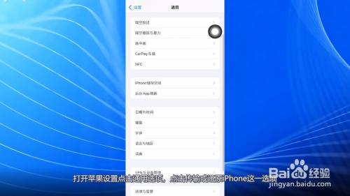 打开苹果设置点击通用选项,点击传输或还原iPhone这一选项。