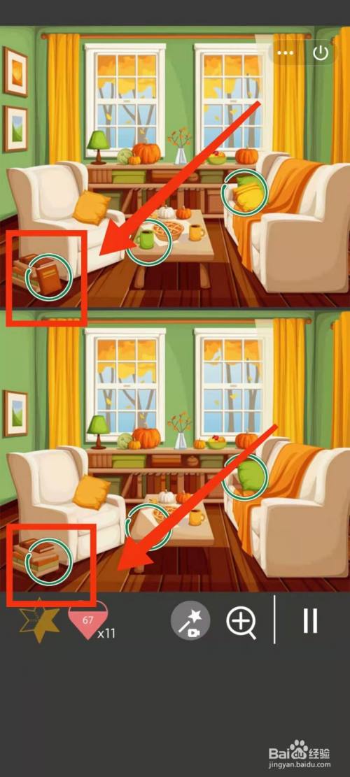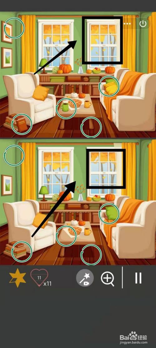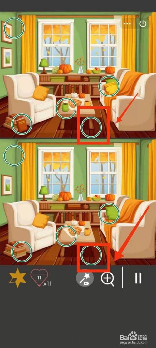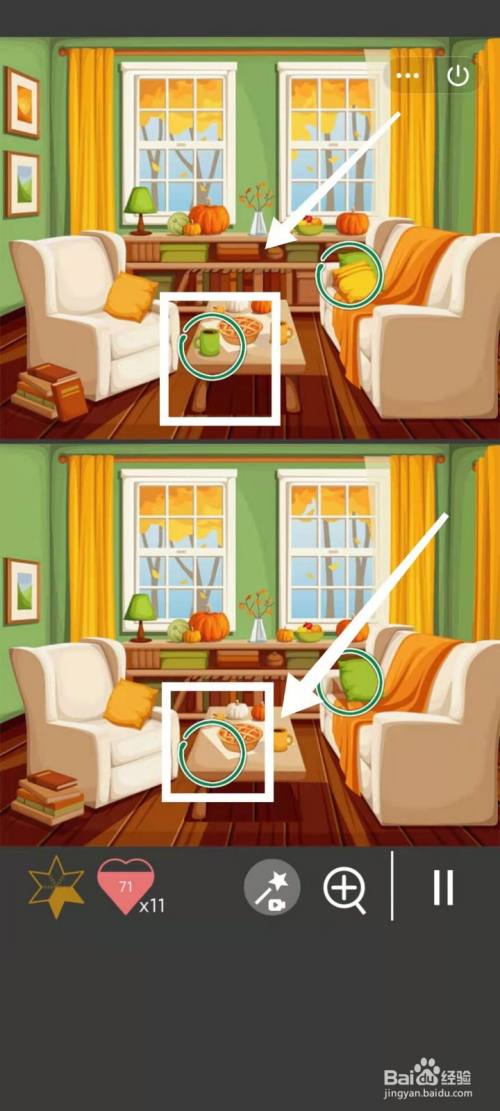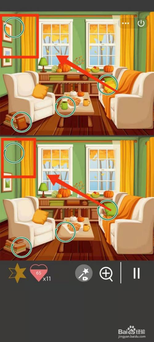 工具/原料小米手机Redmi k30MIUI12.5.3找分歧1500关2方式/步骤1上面沙发上有黄色的抱枕,下面没有。2上面桌子上有绿色的水杯,下面没有3上面沙发旁边有竖着的书,下面没有4上面墙上有两个图,下面没有5上面桌子有桌腿,下面的桌子少一个桌腿6上面窗户有枫叶,下面枫叶少END