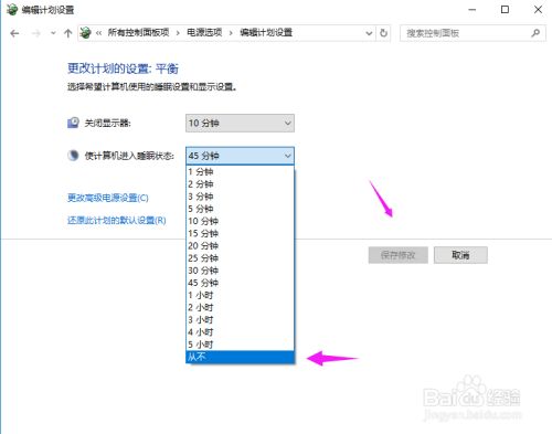 在使计较机进入睡眠状体,选择从不,单击保留更改以完当作高级电源设置。