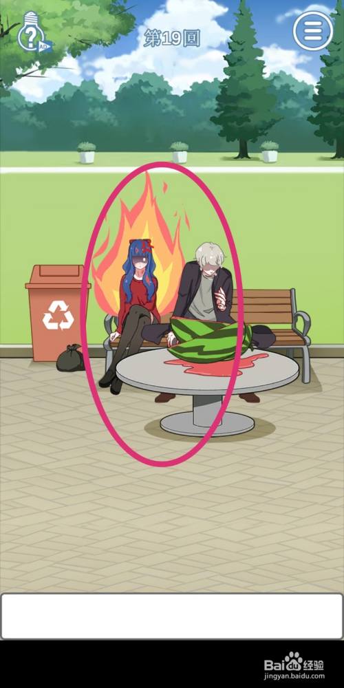 西瓜劈开被挤压出的【果汁】会溅到女生身上,激发女生怒火,游戏过关。