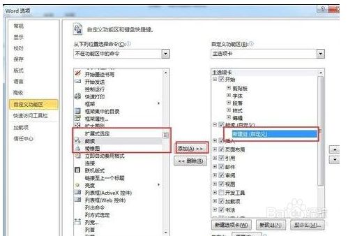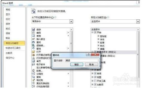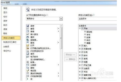 进入“选项”后跳出如下对话框,点击左侧菜单栏自界说功能区。