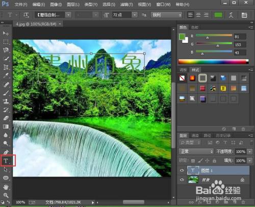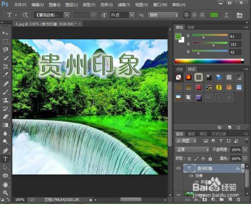 点击文字东西,选择绿色,输入贵州印象;