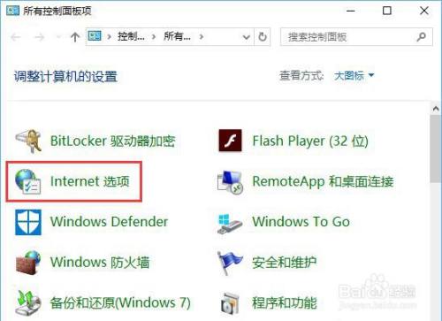 在节制面板中,点窜【查看体例】为大图标,点击【internet 选项】;