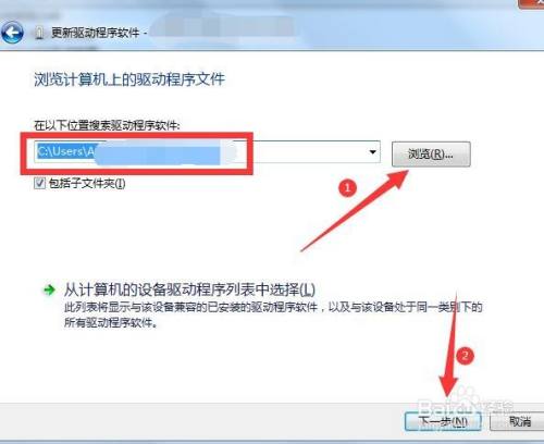 接下来点击“浏览”选择显卡的驱动程序,再点击“下一步”按钮即可