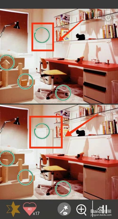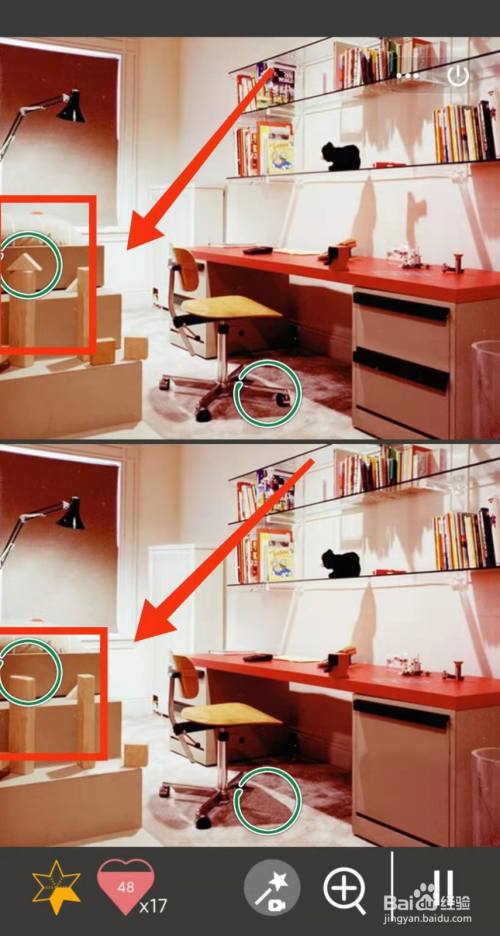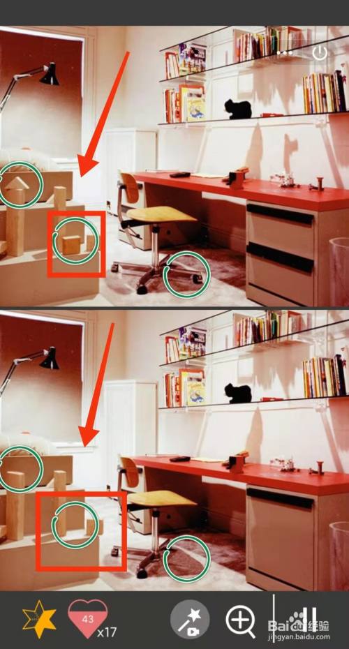 工具/原料小米手机Redmi k30MIUI12.5.3找分歧1500关2方式/步骤1上面的椅子有4个轮,下面少一个2上面有一个三角形的木块,下面没有3上面有一个小方块,下面没有4上面的白色柜子低,下面的白色柜子高5上面有两个黑拉手,下面只有一个6上面有一个竖着的影子,下面没有END