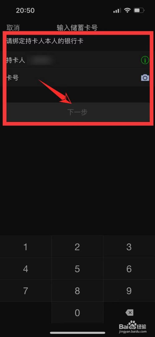 在这里输入与显示的持卡人姓名一致的银行卡卡号,完当作后点击【下一步】就可以绑卡当作功并完当作充值了,这样就将银行卡的钱转到微信了。