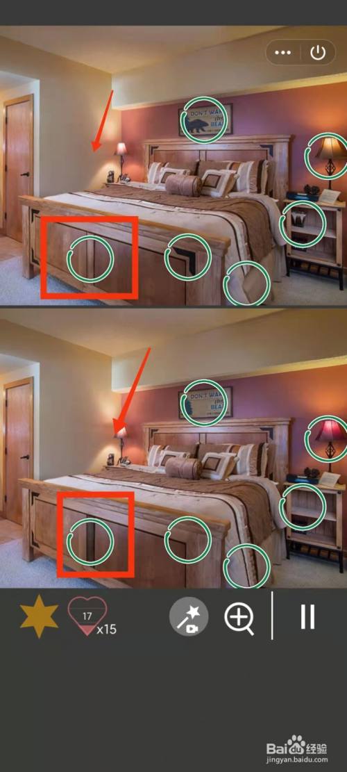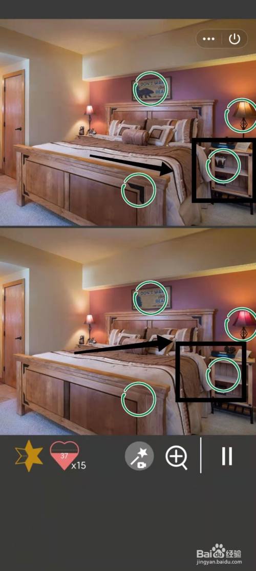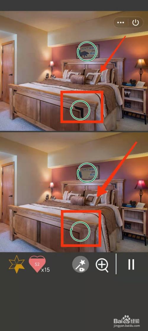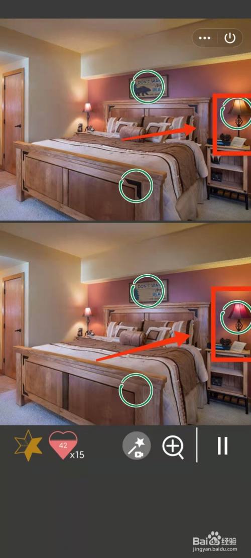 工具/原料小米手机Redmi k30MIUI12.5.3找分歧1500关2方式/步骤1上面墙上的画中有动物,下面的画中没有动物2上面床上有黑色标记,下面没有3上面灯是黄色的,下面灯是红色的4上面柜子里面有摆件,下面没有5上面的被子短,下面的被子长6上面床中心是淡色的,下面床中心是黑色的END