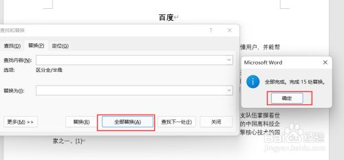 然后点击【全数替代】,可以看到文档中所有的空格就替代完当作了。点击确定。点击封闭。