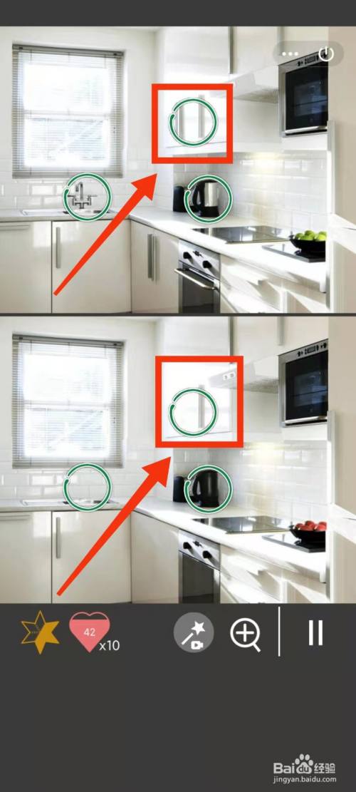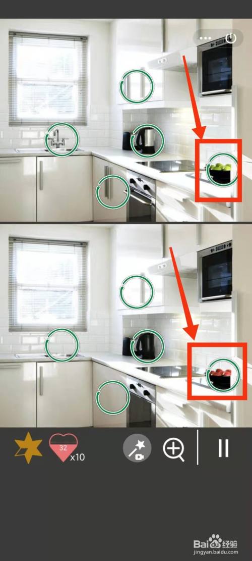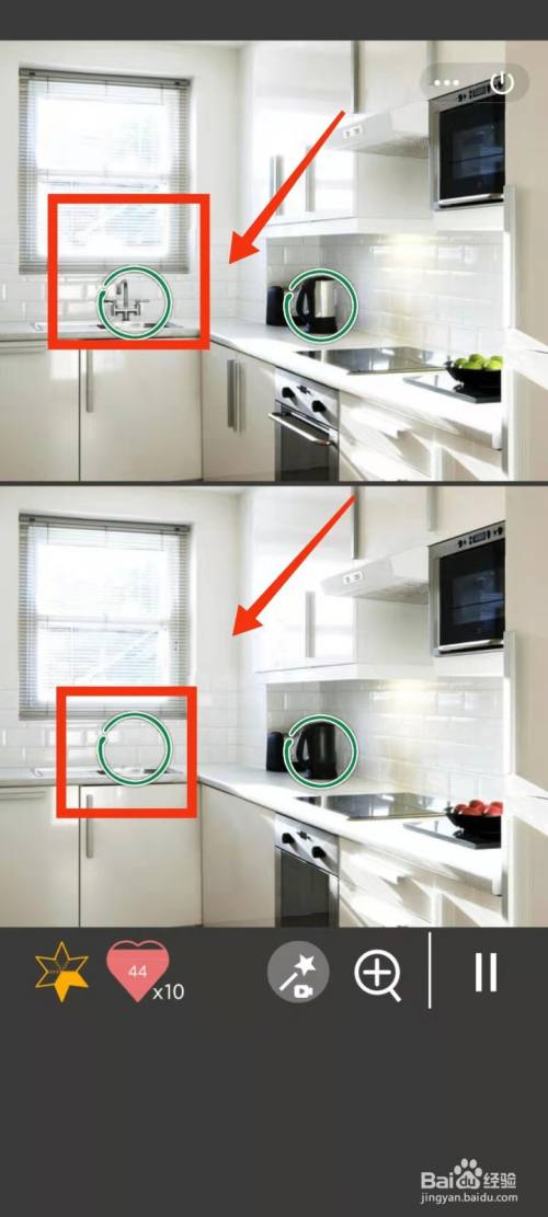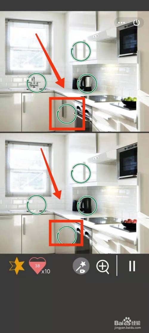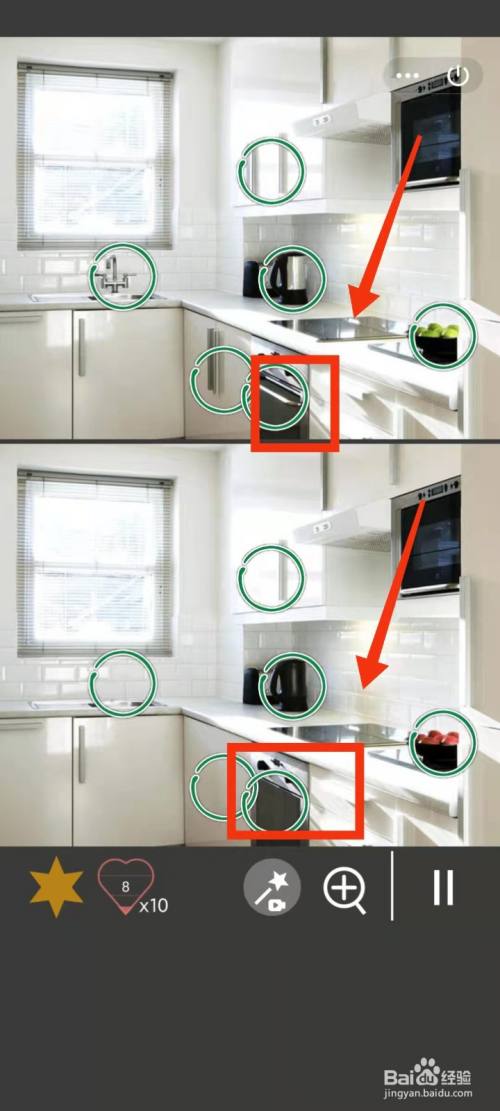 工具/原料小米手机Redmi k30MIUI12.5.3找分歧1500关2方式/步骤1上面的热水壶是银色,下面的热水壶是黑色2上面有水龙头,下面没有水龙头3上面柜子有两个拉手,下面的柜子只有一个4上面下面的柜子只有一个拉手,下面图的柜子没有拉手5上面盘子里面的苹果是绿色,下面的苹果是红色6上面的烤箱有拉手,下面的烤箱没有拉手END