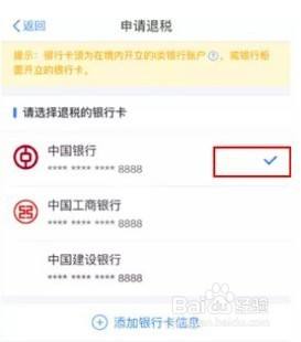最后用户需选择退税银行卡。如前期已添加过银行卡,系统将主动带出已填银行卡信息。您需新增,点击【添加银行卡信息】—【确定】。
