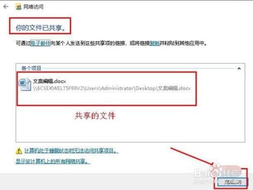 当电脑提醒“您的文件已共享”,就可以查看共享的文件,点击“完当作”。