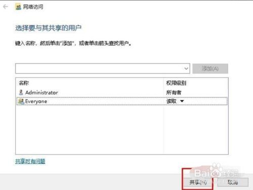 在弹出界面添加用户,若是对局域网内所有效户开放,就填写everyone,点击“添加
