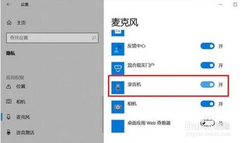 再去测试一下,麦克风是不是可以措辞了。若是我们的灌音机仍是无法利用麦克风的话,只需要点击下面的“灌音机”后面的开关,把其设置为开即可。如图所示: