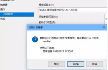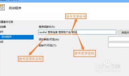 启动程序对话框中的“程序和剧本”栏中输入如下内容,“rasdial 宽带毗连 宽带账户名 密码”,中心用一个空格离隔。