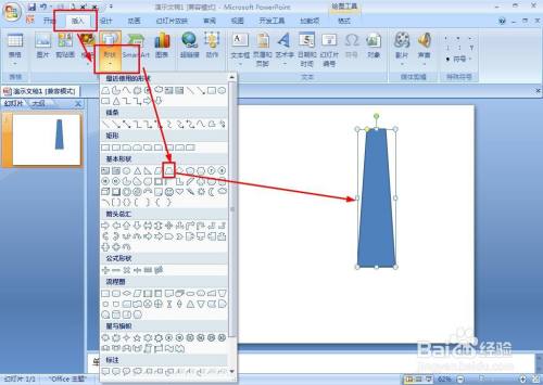 插入——插图——选择外形——选择根基外形中的等腰梯形,画一个竖立的梯形。