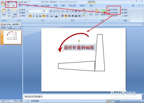 选择环形箭头——起头——外形填充和外形轮廓都设置为红色——插入文本输入:逆时针扭转90度。