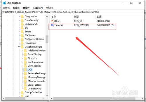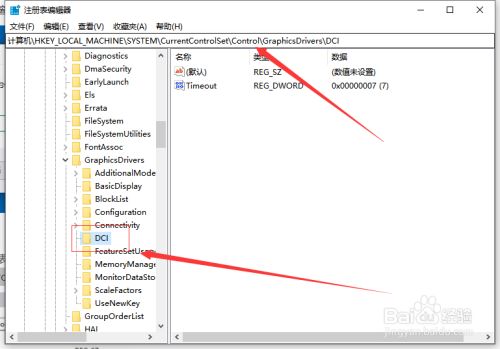 进入注册表编纂器的页面后,我们快速的定位到:HKEY_LOCAL_MACHINE\SYSTEM\CurrentControlSet\Control\GraphicsDrivers\DCI。