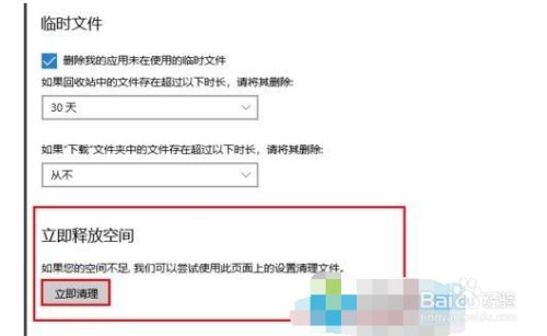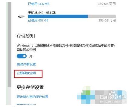 返回到上一个页面,在存储感知下面有一个当即释放空间,鼠标单击,即可对c盘进行清理。