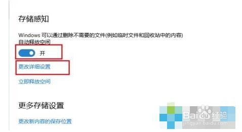 然后我们将储存感知按钮打开,它可以主动清理。在鼠标点击更改详情设置。