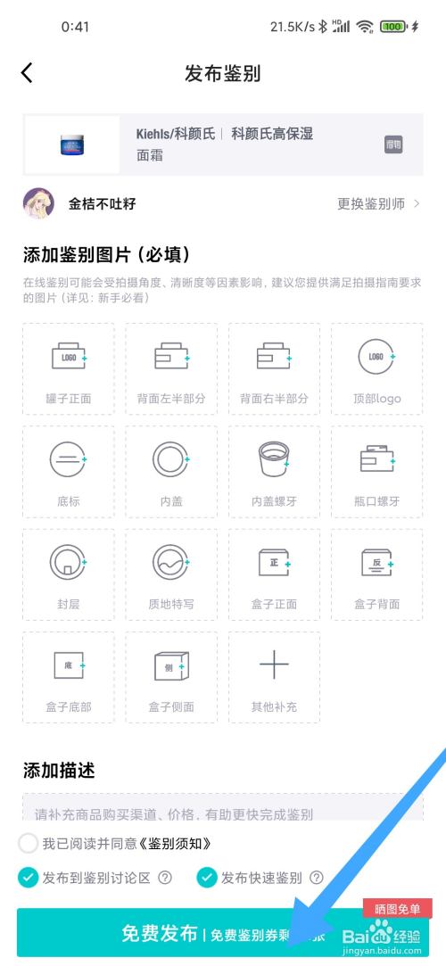最后添加辨别图片和描述,点击免费发布即可识别科颜氏高保湿霜125ml的真假.
