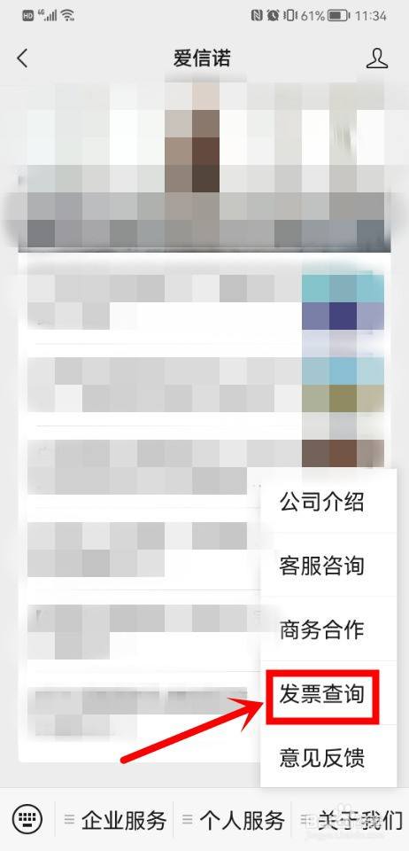 进入爱信诺微信公家,点击关于我们,选择发票查询