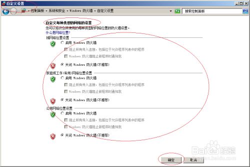 勾选"域收集位置设置、家庭或工作(专用)收集位置设置、公用收集位置设置→封闭Windows防火墙"单选框