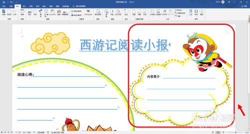 最后在页面右上角画蓝色书本简笔画和绿色气泡外形文本框,并填写“好句好词”的文本内容。这样西纪行阅读小报就画好了。
