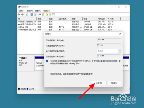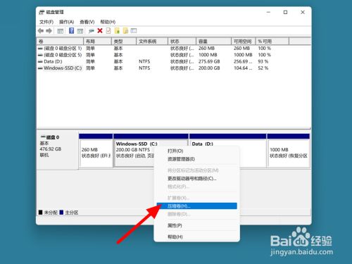在磁盘办理中选择c盘,鼠标右击,点击压缩卷。