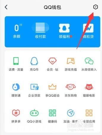 随后,进入QQ钱包页面,点击右上角的【设置】图标。(如图所示)