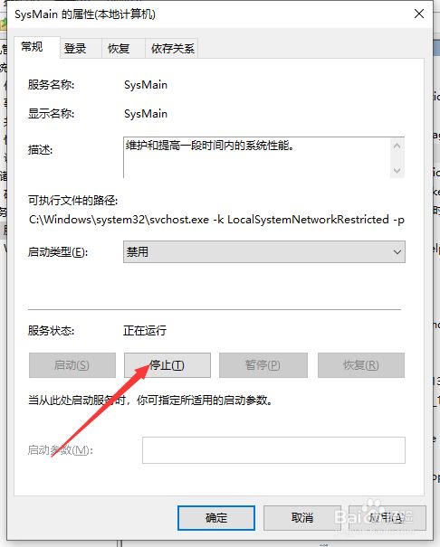 在其属性界面中,我们将启动类型设置为禁用,同时,点击停用按钮。