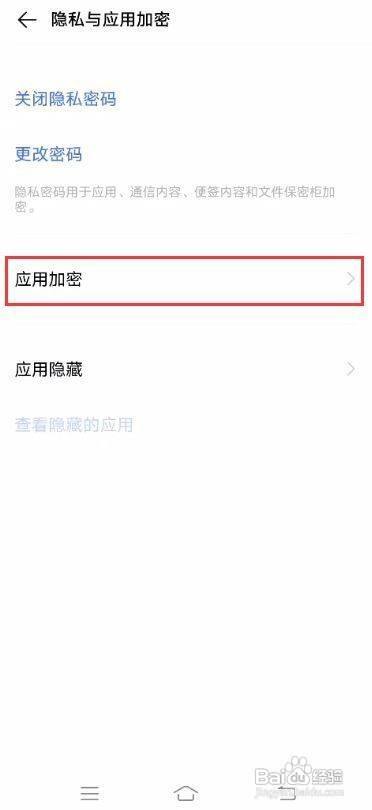 在隐私与应用加密界面中,需要先设置隐私密码密保,设置完当作后点击应用加密。