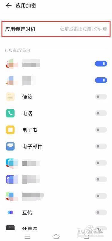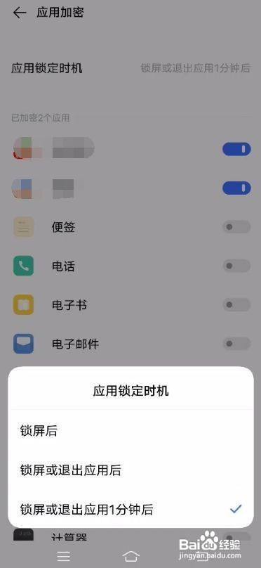 在应用加密界面中,还可以点击应用锁按时机选择分歧的锁按时机即可开启。