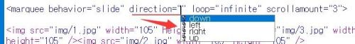 在代码中,把方才插入图片的代码,剪切粘贴到<marquee></marquee>中,在<marquee>中,在输入滚动的代码,如图所示