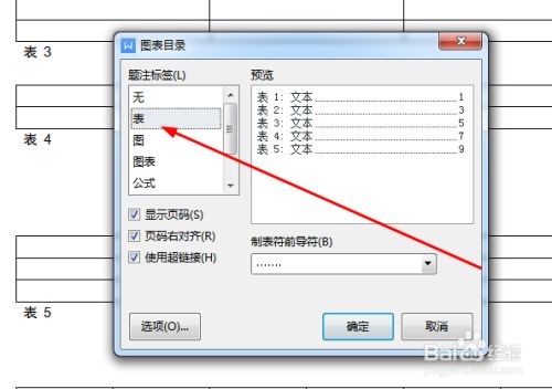 光标放在空白页上,点击“表”,选择前导符样式,点击确定。