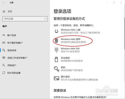 5、登录选项中呈现很多多少种登录设备的体例,点击“Windows Hello 指纹”