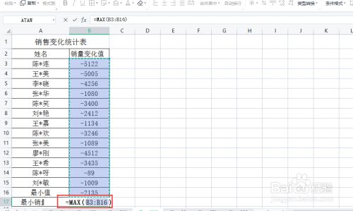 在“最小销量转变”右边的空白单位格输入公式“=MAX(B3:B16)”。