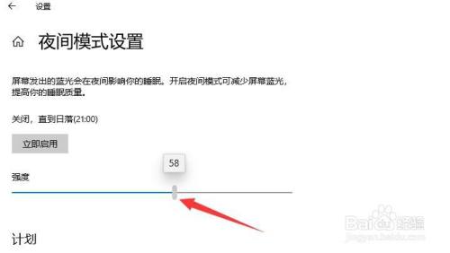 如图所示,在夜间模式设置界面中,我们可以针对屏幕的亮度和强度进行设置。