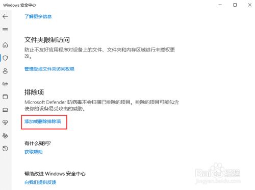 06.解除项(Microsoft Defender 防病毒不会扫描已解除的项目。解除的项目可能包含使您的设备易受进犯的威胁)下,点击添加或删除解除项;